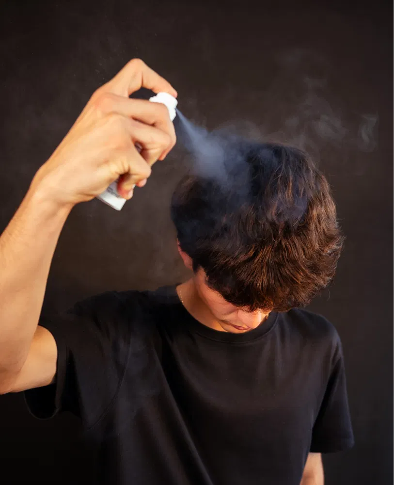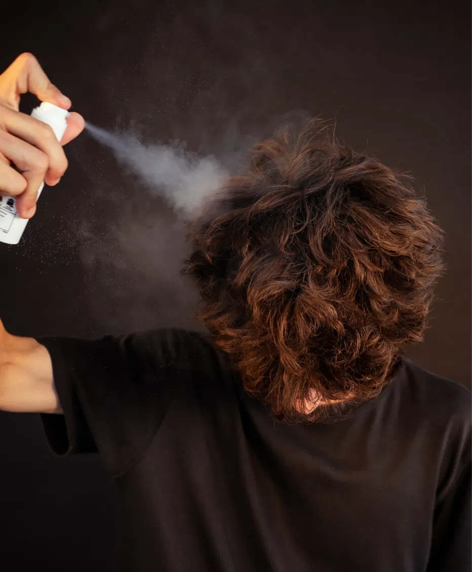 With your hand at least 2 inches from your head, apply 2-3 pumps of powder to dry hair. Use your fingers to evenly distribute the powder throughout your hair. If you need more hold, add some more product.